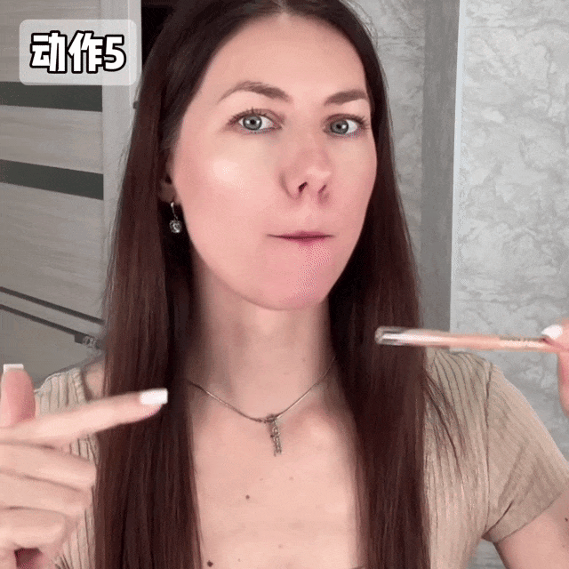 面对镜子自然站立,手握一支笔嘴巴吸住两侧脸,然后还原嘴巴向中间吸的时候,手指向中间指还原的时候,双手向两侧重复练习10-20组